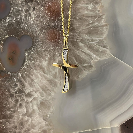 14K yellow gold cross set with 0.05 carats of round brilliant diamonds. Chain Sold Separately.
