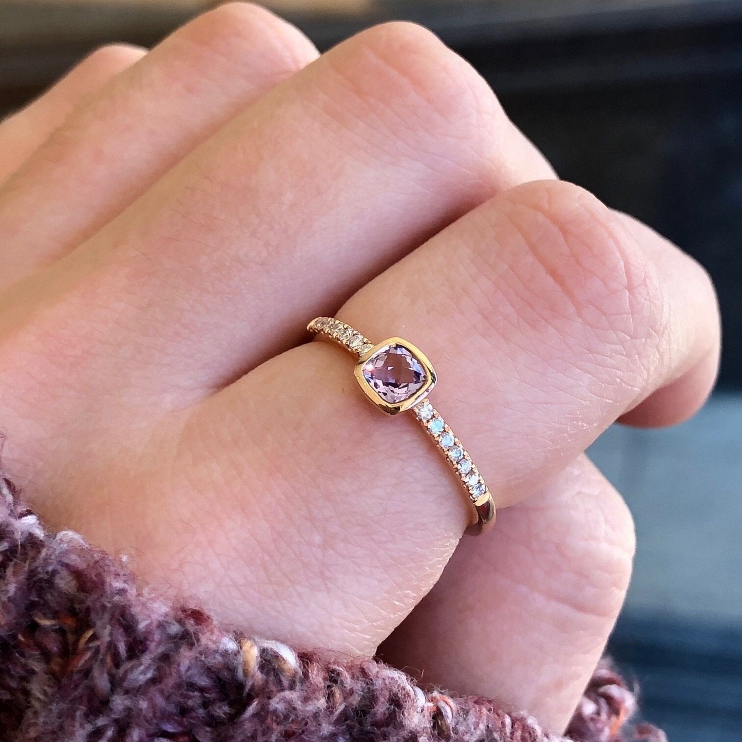 14K rose gold ring with a bezel-set 0.29ct Rose de France amethyst center with 0.11 carats of round brilliant diamond accents. Great for stacking! Size 7 in stock, text or call to inquire about sizing.